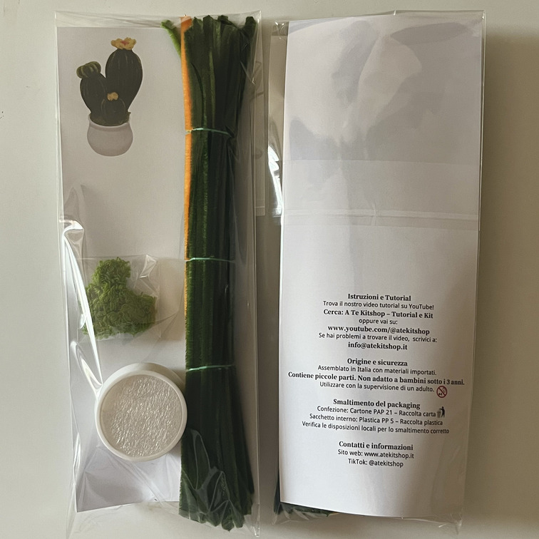 Il kit include tutto l’occorrente per creare tre simpatici cactus con fiorellini colorati.