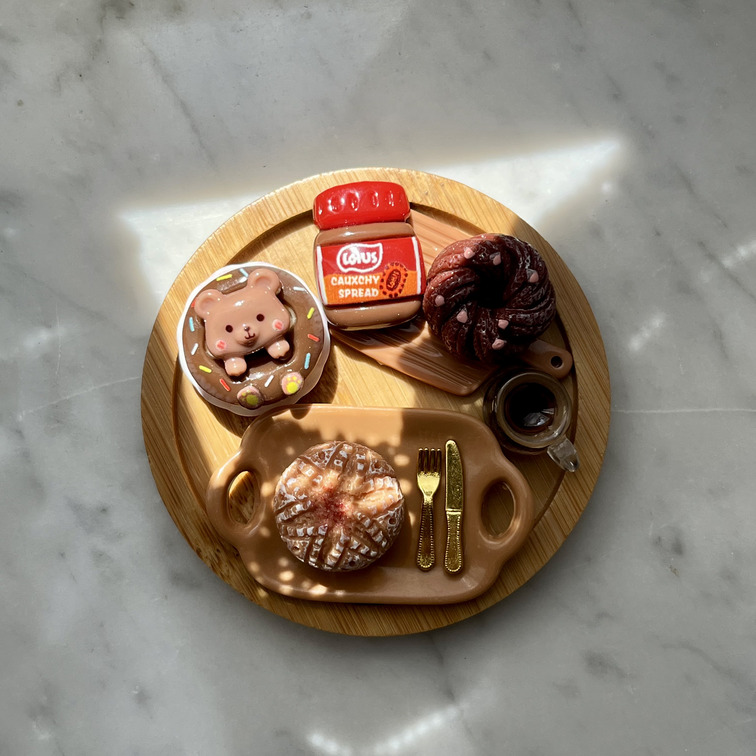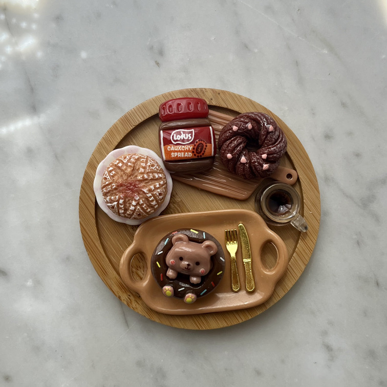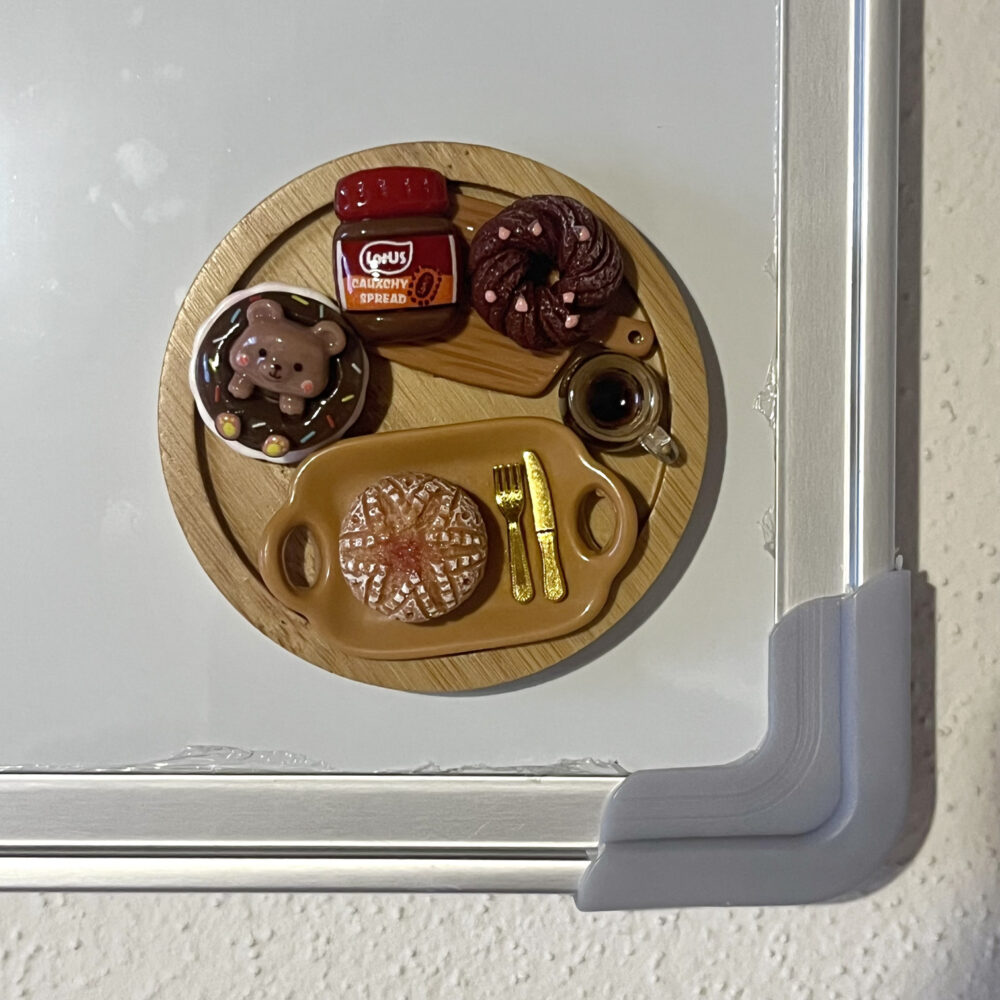 • 4 elementi magnetici mobili: Ciambella al cioccolato con orsetto, Pagnotta dolce glassata, Crema spalmabile Lotus, Ciambella al cacao.