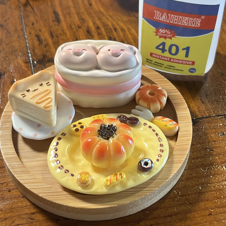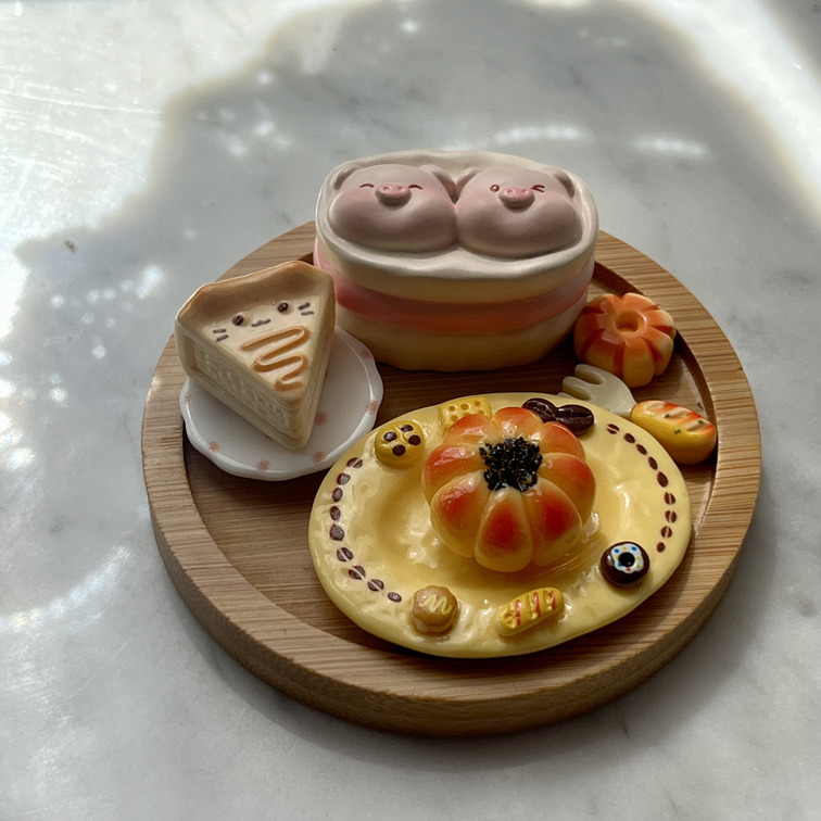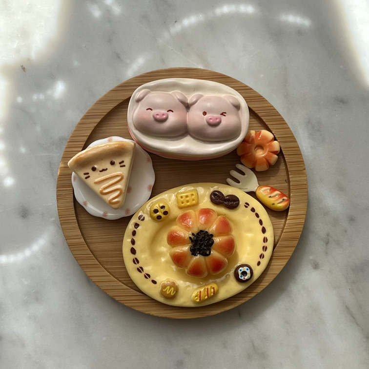 • Componenti fissi (da incollare): Coppia di maialini decorativi (36×23×23 mm,), Paninetto tondo glassato, Piatto bianco con pois gialli, Piatto fondo giallo, Forchetta piccola
