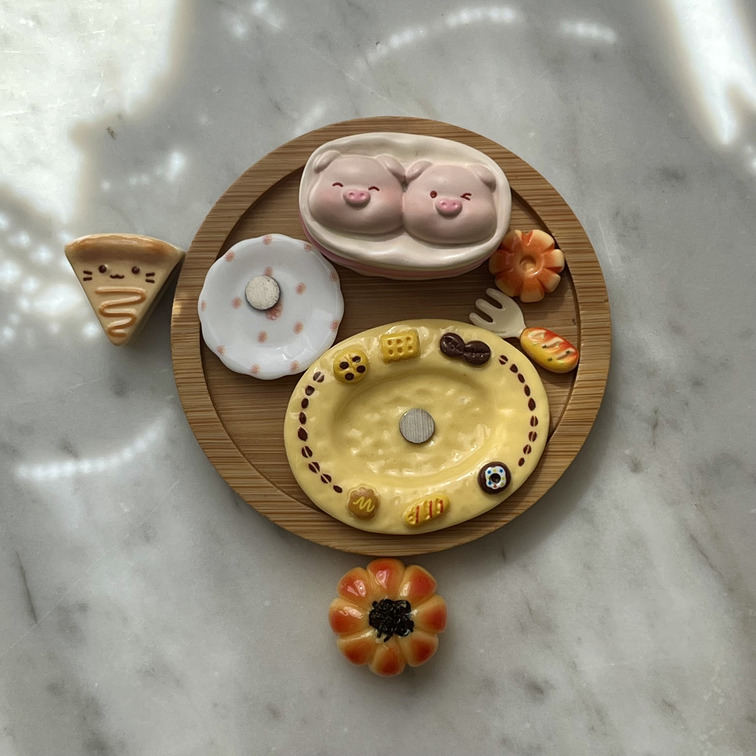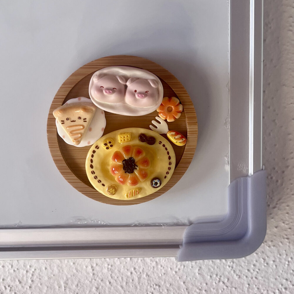 • 2 elementi magnetici rimovibili: Fetta di cheesecake all’arancia, Tortina a forma di zucca con sesamo