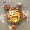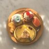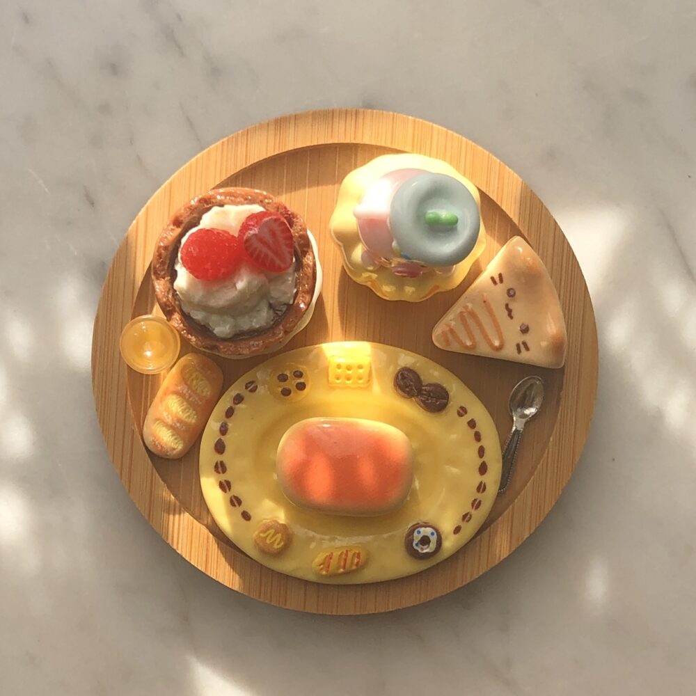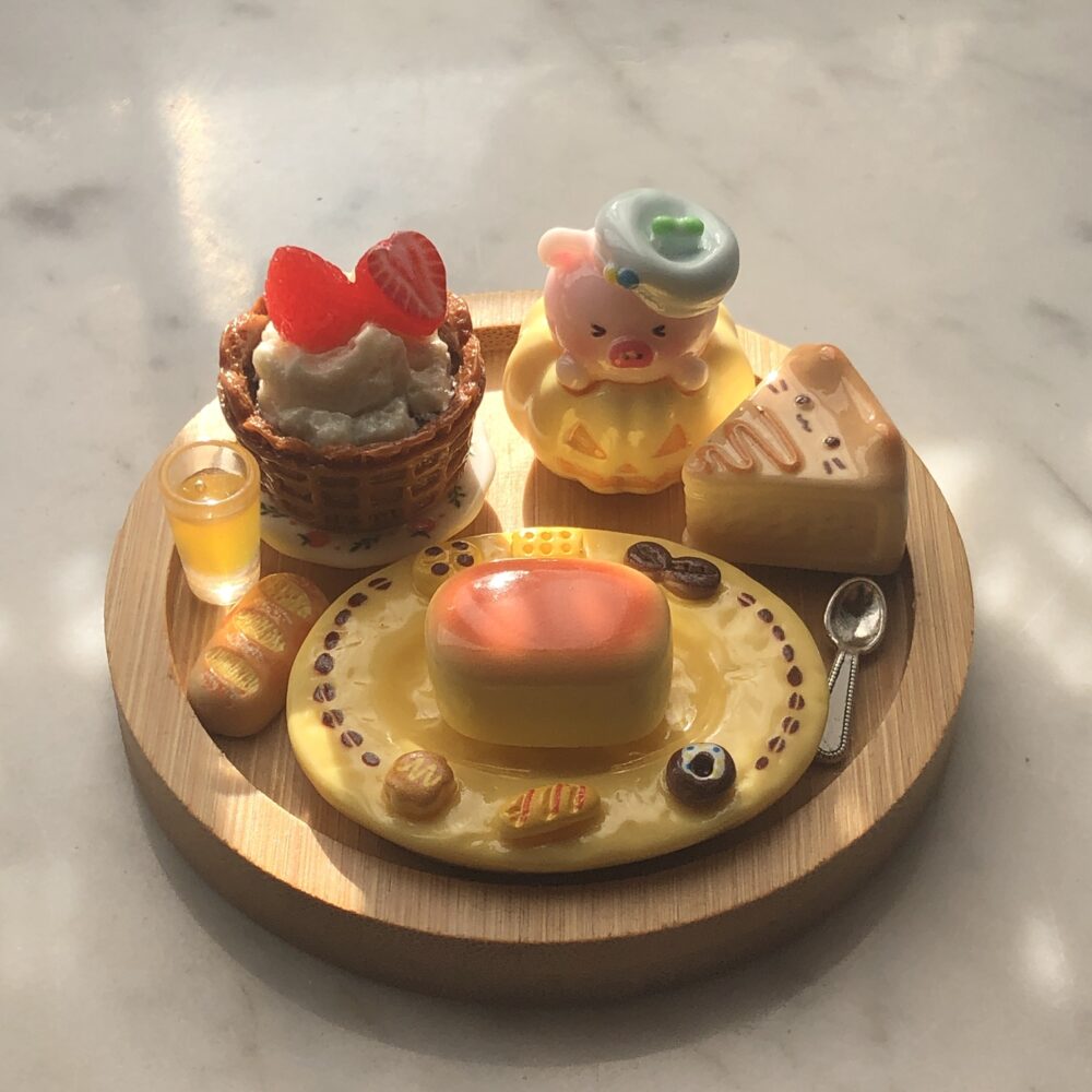 • Componenti fissi(da incollare): Piatto ovale giallo con decori, Cucchiaino, Piatto rotondo con dettagli di cachi, Pane dolce, Succo d’arancio.