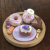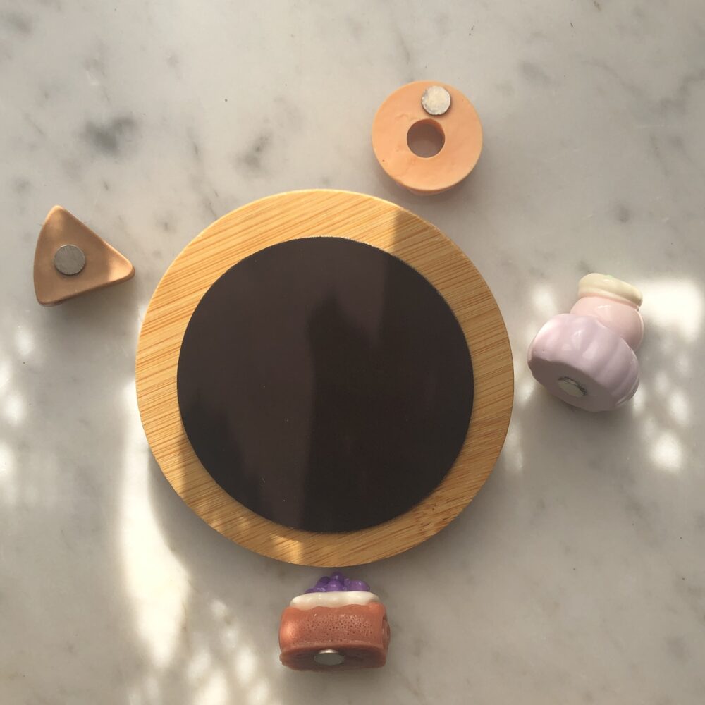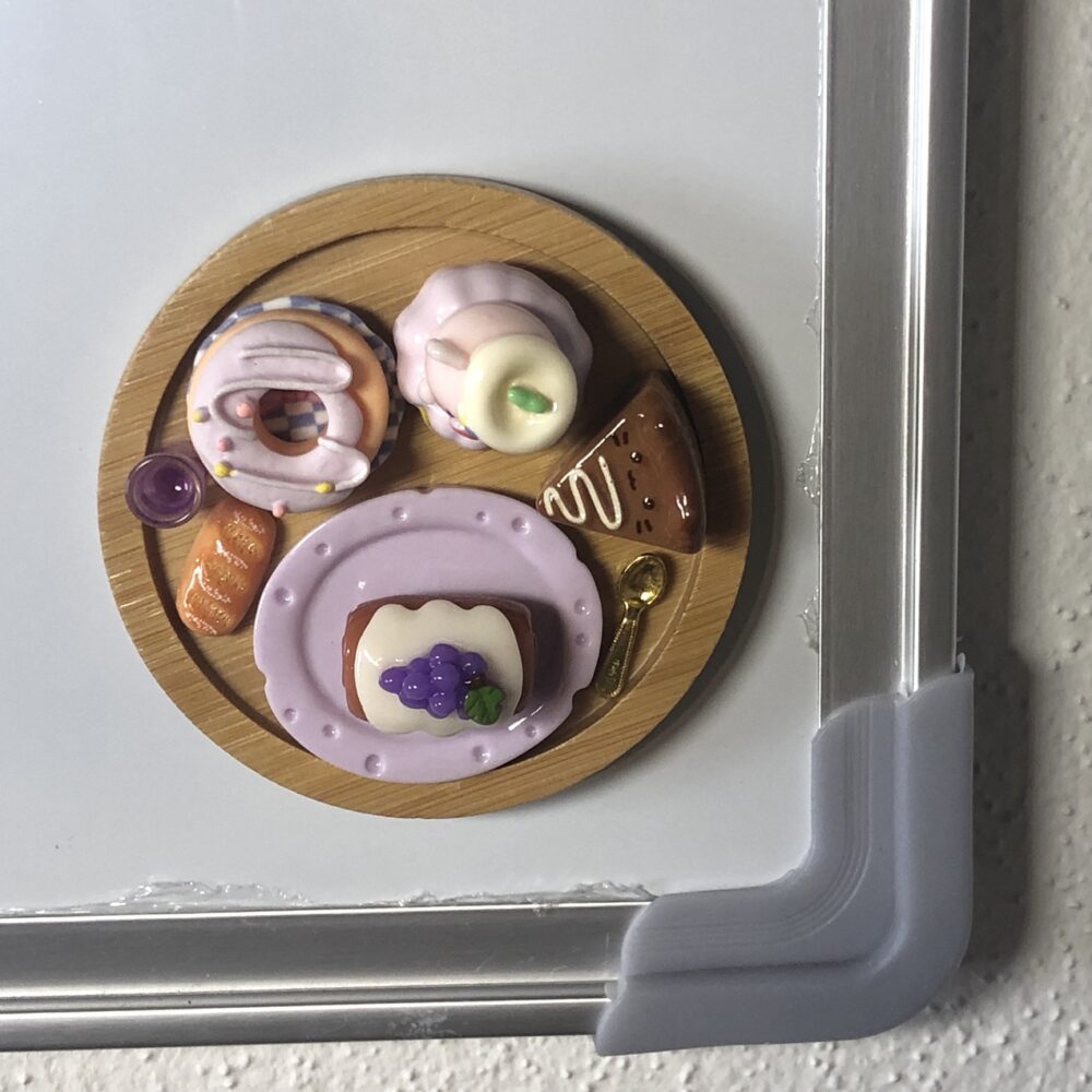 • 4 elementi magnetici rimovibili: Ciambella alla glassa viola, Rotolino all’uva e panna, Maialino sulla zucca lilla, Fetta di torta al cacao.