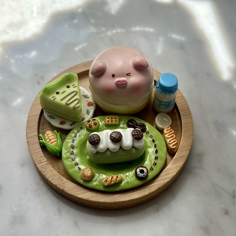 • Componenti fissi (da incollare): Piatto ovale grande verde,Piatto bianco decorato con carotine, Maialino decorativo (31x30x25 mm), Bottiglietta di latte e cucchiaio, Pannocchia in miniatura e altri decori fissi