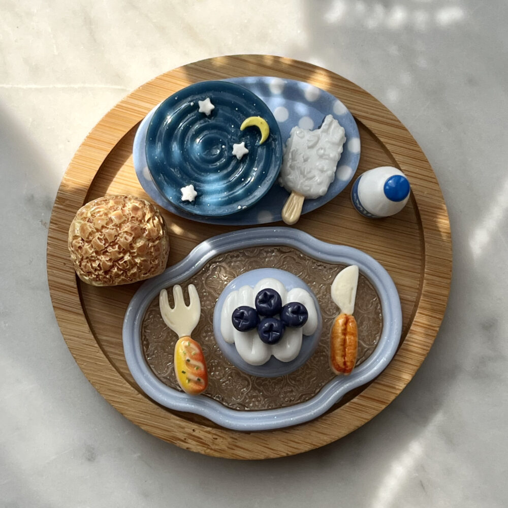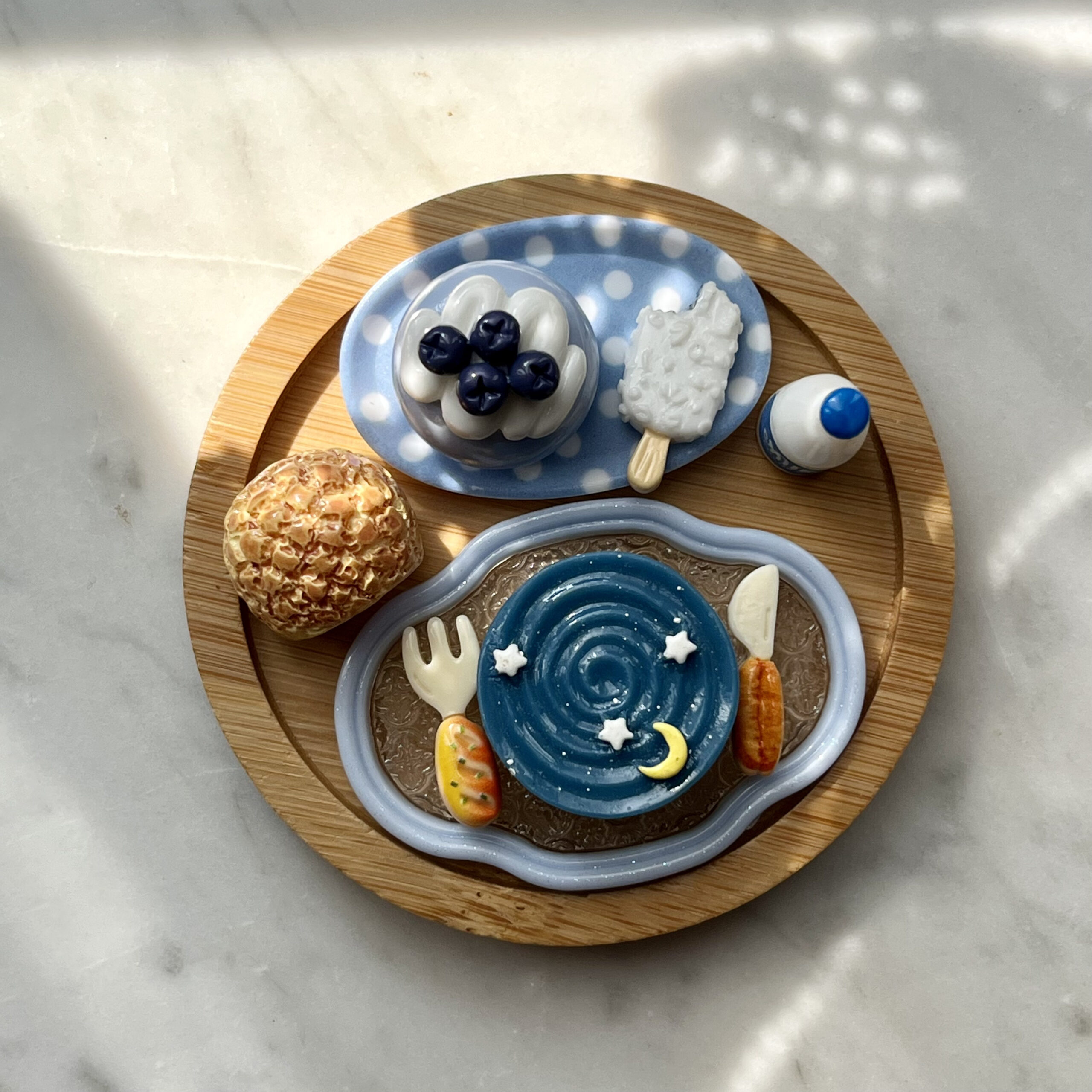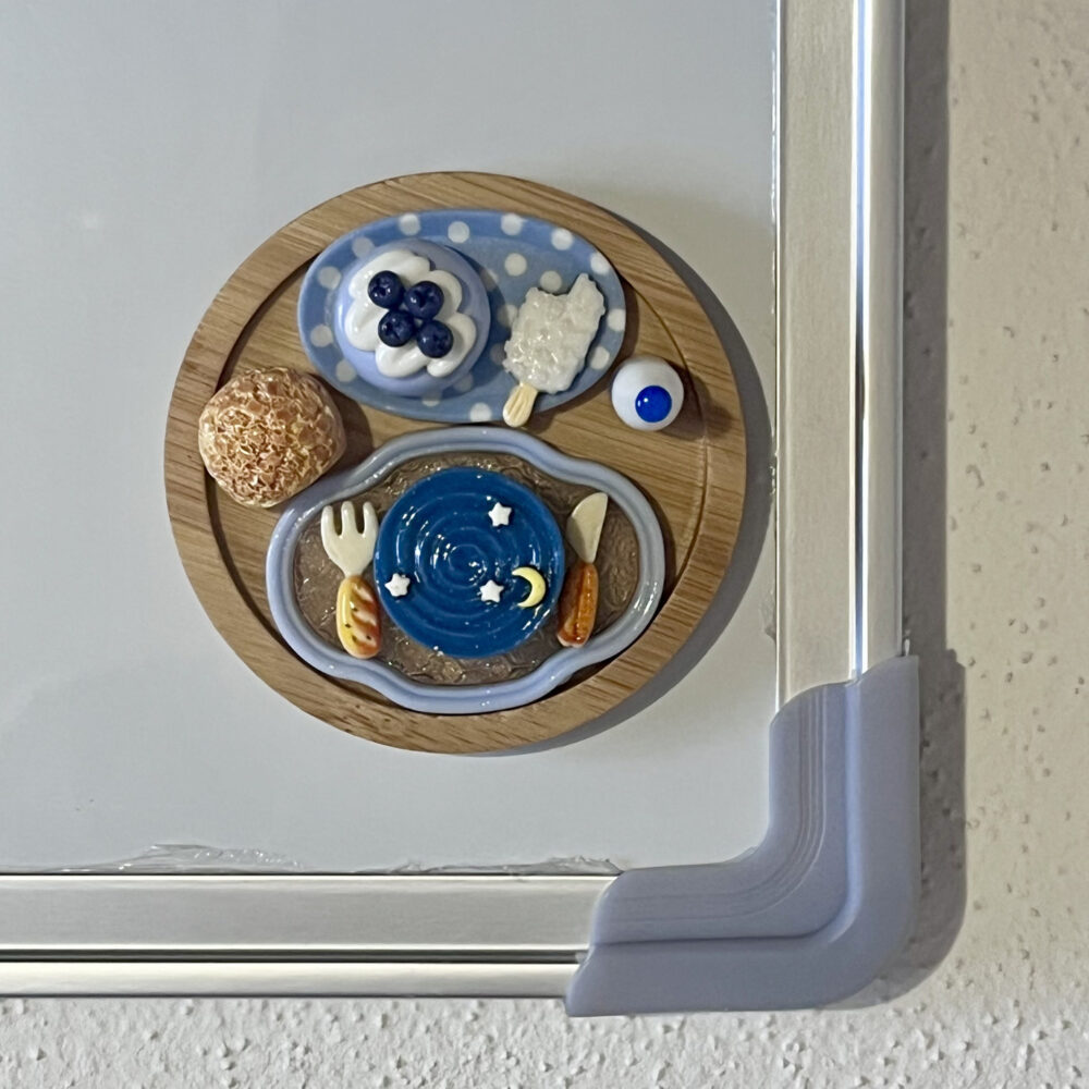 • 3 elementi magnetici rimovibili: Crostatina ai mirtilli con panna, Torta decorata con luna e stelle, Bignè dorato