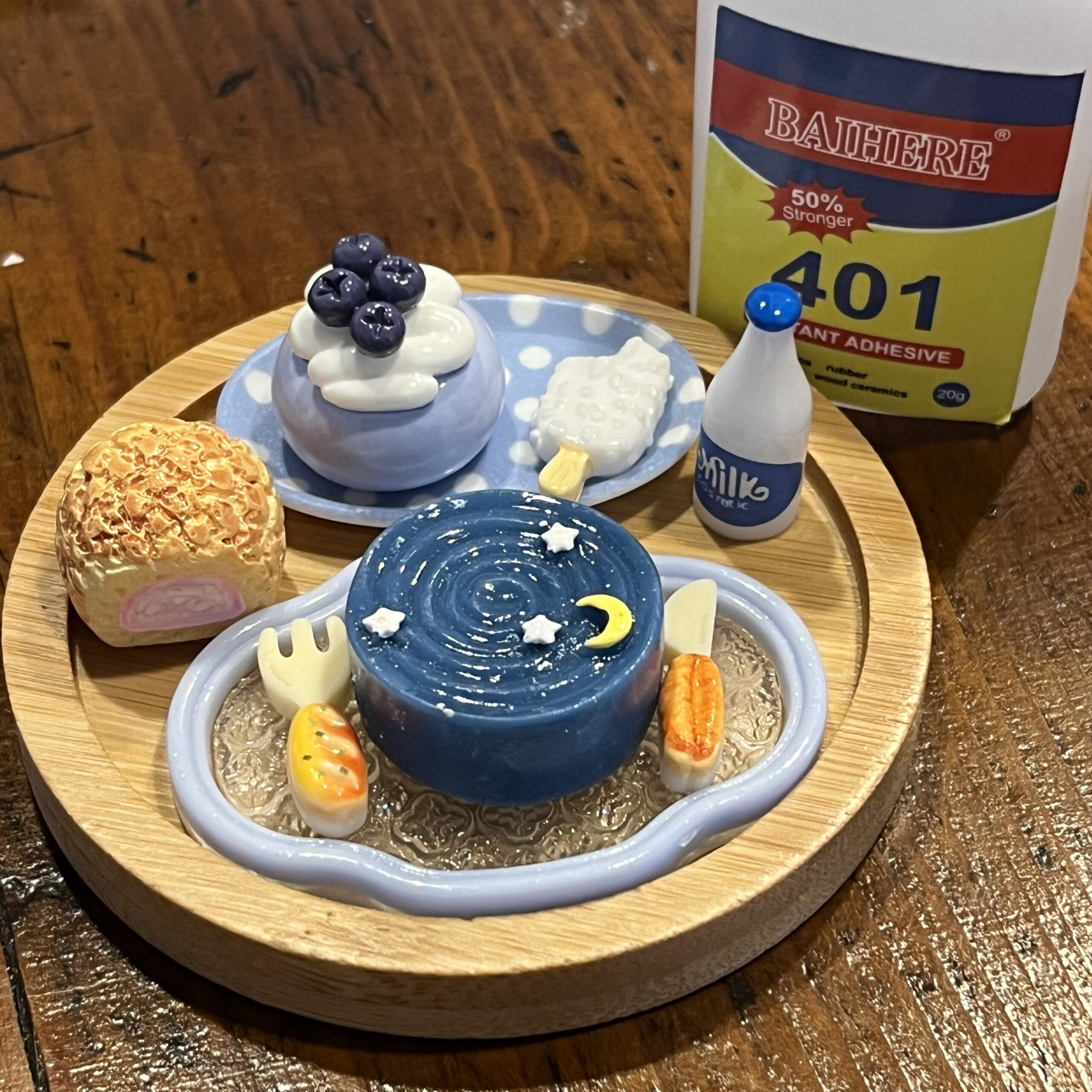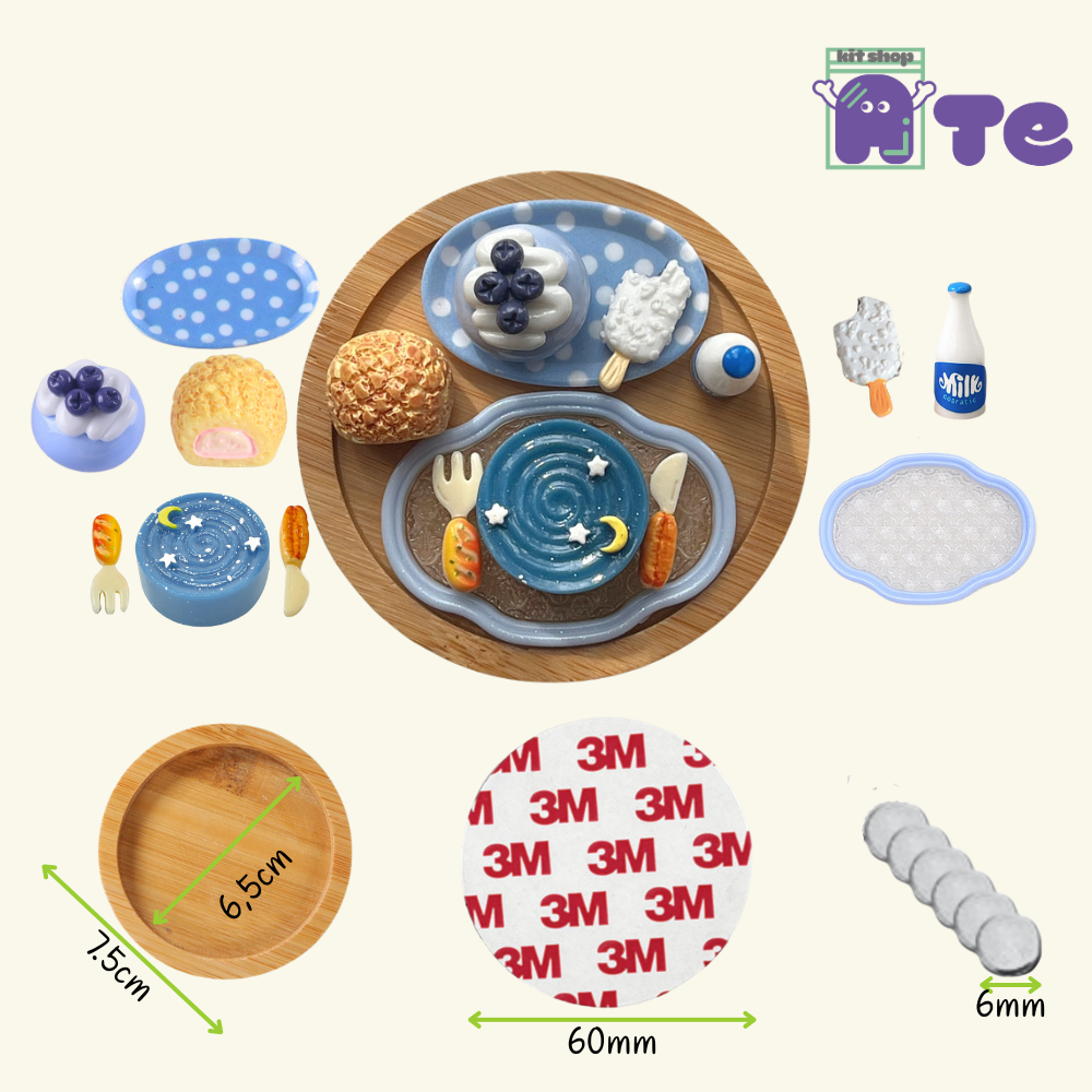 • Componenti fissi (da incollare): Gelato beige con panna montata, Bottiglietta di latte blu, Piatto ovale a pois bianchi e azzurri, Piatto con bordo celeste e posate decorative