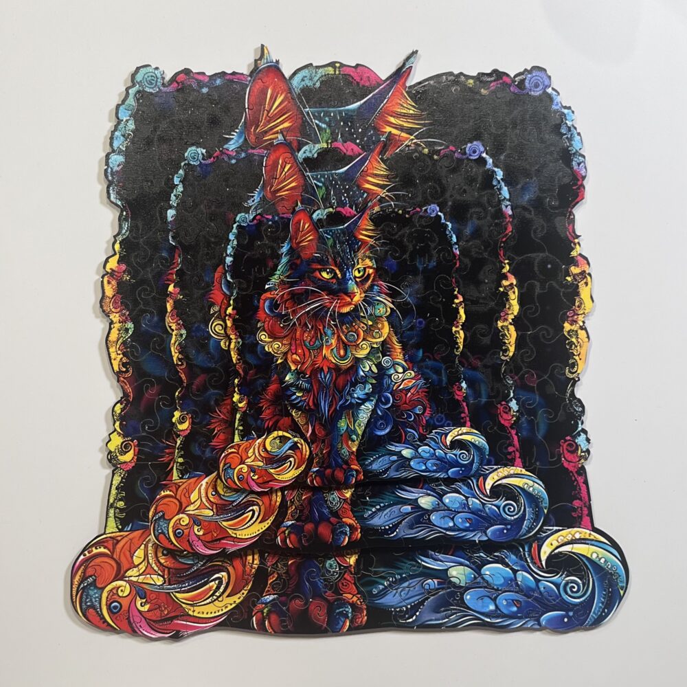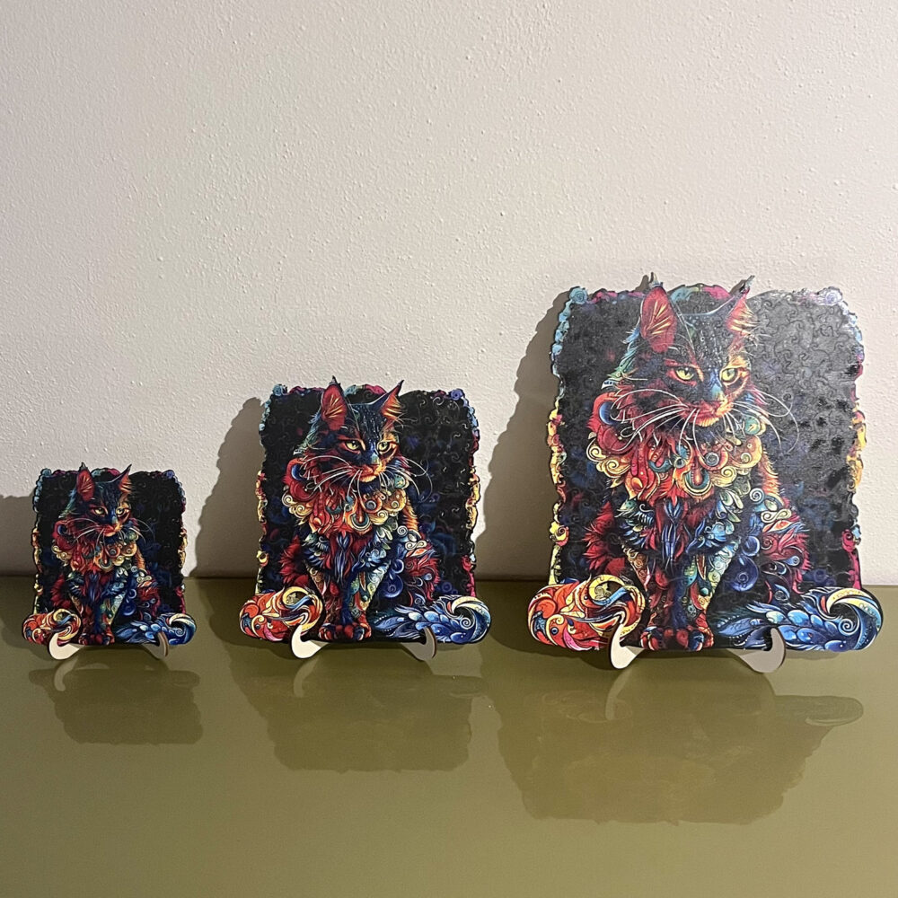 Porta nella tua casa l’eleganza misteriosa del gatto con questo puzzle in legno a taglio irregolare. Ogni pezzo, tagliato con precisione, si incastra perfettamente dando vita a un’esperienza creativa e rilassante. Una volta completato, il puzzle diventa una splendida decorazione, capace di aggiungere un tocco artistico e colorato ai tuoi ambienti.
